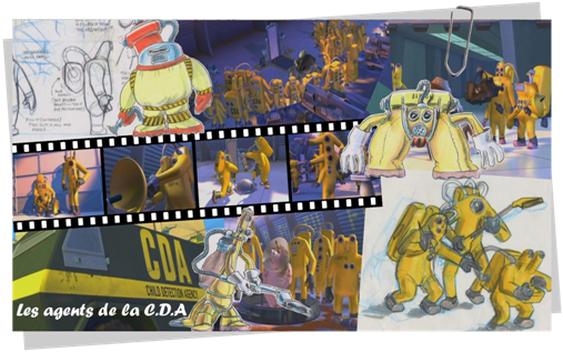A la simple évocation de leur nom, les monstres de l'usine Monstres & Cie frissonnent ! Les agents de la CDA (Child Detection Agency) sont chargés de décontaminer le monde des monstres de tout objet humain qui y aurait été ramené par erreur. Equipés de combinaisons jaunes, on ne voit jamais leur tête. Ils ont tout l'attirail nécessaire à la décontamination et leurs méthodes sont radicales. Le pauvre George Sanderson en fait d'ailleurs les frais après avoir ramené une chaussette d'enfant dans l'usine... On apprend à la fin du film que Germaine est la chef secrète de l'Agence. |