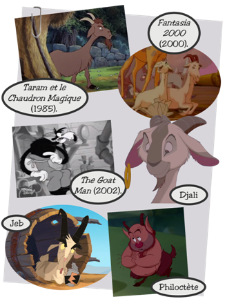 En 2004, dans le Grand Classique La Ferme se Rebelle, l’un des résidents de la propriété de la fermière Pearl Gesner, le Coin de Paradis, est un vieux bouc grincheux prénommé Jeb. Très attaché au vieux tonneau dans lequel il dort et aux nombreuses boîtes de conserves vides qui s’y accumulent, il ne supporte pas que quiconque d’autre que lui touche à ses biens. Mais derrière son apparent mauvais caractère, le bouc cache en fait un grand cœur ! Il est aussi apparu dans plusieurs productions dérivées du 45ème Grand Classique Disney, à commencer par le court-métrage Un conte de lait : Les Trois Petits Cochons (2004). Des personnages de Grands Classiques, qui ne sont pas des chèvres ou des boucs à l’origine, ont pris l’apparence de caprins le temps d’une transformation magique. C’est le cas de Merlin qui se transforme quelques instants en bouc au pelage bleu lors de son duel de magie contre Madame Mim ou du Génie d’Aladdin (1992), maître de la métamorphose, qui prend, parmi de multiples autres apparences, celle d’un bouc. Plusieurs créatures ayant en partie l’apparence de caprins sont aussi apparus dans des productions Disney. Il s’agit notamment des Satyres, ces hybrides mi-hommes, mi-boucs issus de la mythologique grecque. Plusieurs d’entre eux figurent au casting de la séquence La Symphonie Pastorale, l’un des segments du Grand Classique Fantasia (1940). En 1997, une autre de ces créatures va marquer les esprits : il s’agit de Philoctète, l’entraîneur des héros qui va prendre Hercule sous son aile. Grand amateur de femmes, c’est en se faisant passer pour un bouc, parmi un troupeau de chèvres, que le Satyre espionne des Nymphes légèrement vêtues s’ébrouer, avant que par mégarde Hercule ne finisse par révéler la supercherie… Au grand dam de Philoctète ! Une autre créature hydride, seulement en partie caprin, est apparue dans un court-métrage réalisé pour la série télévisée Disney’s Tous en Boîte : il s’agit de The Goat Man, un animal ayant des cornes et une barbichette de bouc mais un visage et un corps qui ressembleraient plutôt à ceux d’un chien antropomorphe à la façon Disney. Ce méchant s’en prend à Mickey, Minnie et Mortimer dans le court-métrage Mickey and the Goat Man (2002) dont l’esthétique reprend celle des épisodes de la série Mickey Mouse des années 1920-1930. Beaucoup de caprins sont apparus le temps d’un épisode dans des séries télévisées estampillées Disney, sans véritablement avoir marqué les esprits. |