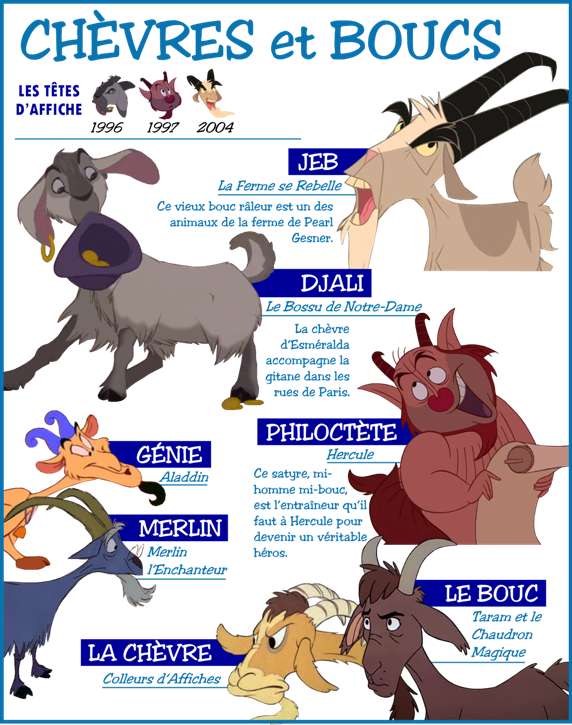 Il faudra attendre les années 1990 pour qu’un caprin occupe un rôle d’importance dans un Grand Classique Disney : il s’agit de Djali, la chèvre apprivoisée de la gitane Esmeralda. La chèvre au fort caractère accompagne la saltimbanque de rues dans tous ses déplacements, même les plus périlleux ! D’abord totalement insensible au charme de la gargouille aux cornes caprines La Rocaille, elle finit par se montrer beaucoup plus encline à ses avances ! Dans Fantasia 2000 (2000), un couple de chèvre et bouc apparaît parmi les nombreux animaux qui embarquent sur l'arche de Noé dans le segment Pomp and Circumstances. |
