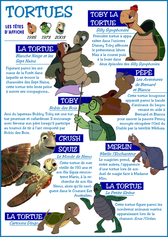 Toby est sans doute un prénom prédestiné aux tortues (voire aussi aux chiens...). On retrouve en tout cas à nouveau un prénommé Toby dans le Grand Classique Robin des Bois (1973), une jeune tortue binoclarde peureuse et qui a tendance à cafarder. Autre tortue, son père participe au tournoi de tir à l'arc organisé pour capturer Robin. En 1977, une nouvelle tortue apparaît dans Les Aventures de Bernard et Bianca. Prénommée Pépé (sûrement à cause de son âge avancé), elle fait partie de la bande de petits animaux habitant dans le Bayou du Diable et qui aident Bernard et Bianca à sauver Penny des mains de Médusa. N'oublions pas la rapide transformation de Merlin en tortue lors de son duel avec Madame Mim, et celle de Kuzco lors de son combat contre Yzma. Enfin, leurs apparitions sont plus brèves, mais l'on se doit de mentionner les tortues qui sont de passage dans La Petite Sirène, lors des chansons "Sous l'Océan" et "Embrasse-La", celles que l'on aperçoit dans Mary Poppins, celles de Pocahontas (pendant la chanson "Au détour de la rivière"), celles qui figurent dans le segment Pomp and Circumstances de Fantasia 2000, ou celle que l'on peut voir dans Il Etait Une Fois. Comme quoi, une tortue sait aussi être rapide lorsqu'il s'agit d'avoir un rôle dans un film d'animation Disney ! |