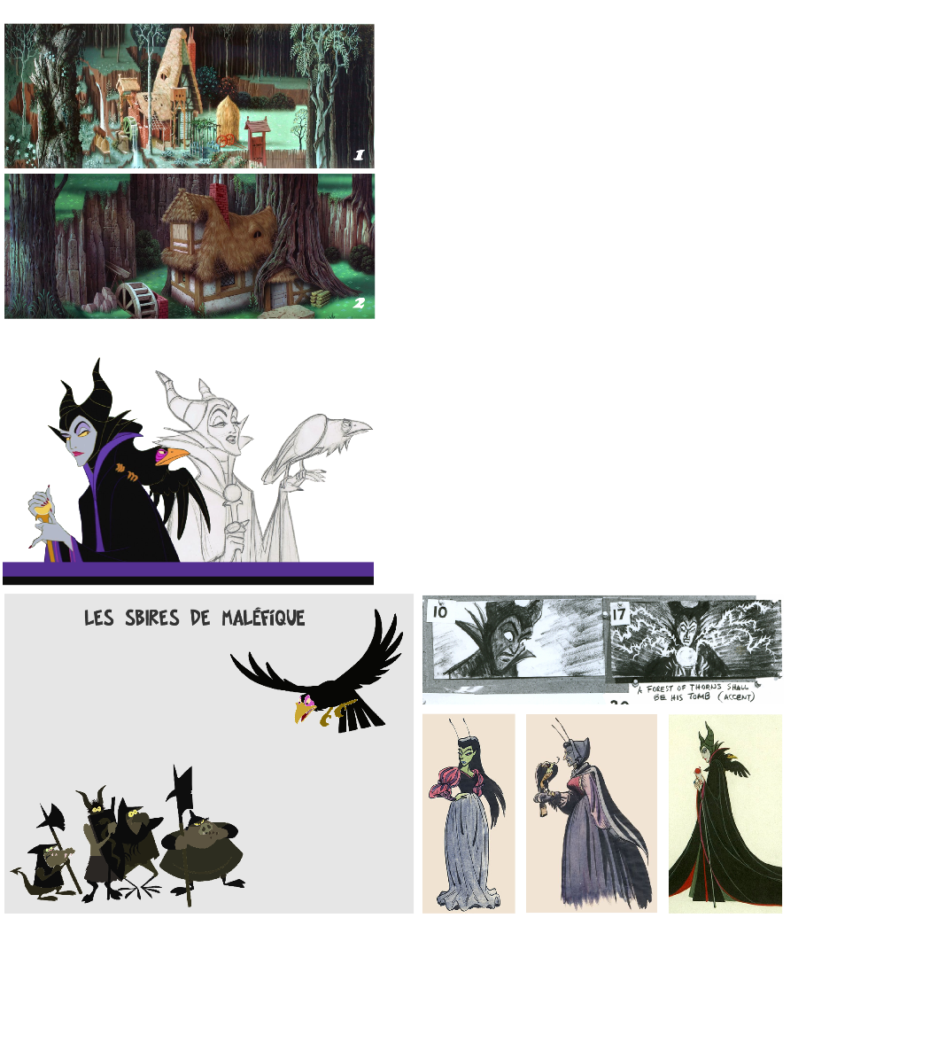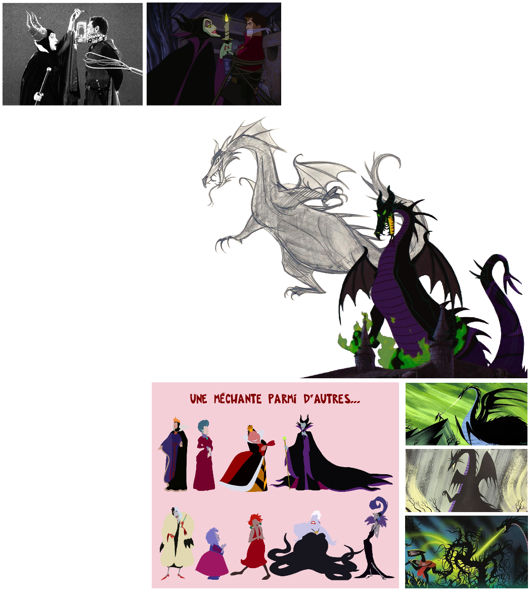 A gauche : images de Maléfique dans le storyboard conçu pour La Belle au Bois Dormant.
