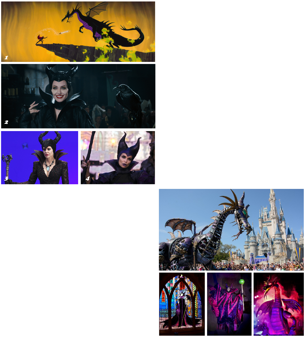 Aujourd’hui, la popularité de Maléfique ne se dément pas dans les parcs à thèmes Disney à travers le monde. Elle y apparaît lors de nombreux spectacles et parades. Elle affronte Mickey sous sa forme de dragon dans le célèbre spectacle nocturne Fantasmic! (Disneyland Resort, Walt Disney World et Tokyo Disneyland). Un char la faisant apparaître sous sa forme de dragon défilait lors de la parade nocturne Disney Fantillusion (de 1995 à 2001 à Tokyo Disneyland puis de 2003 à 2012 à Disneyland Paris). Plus récemment, un char-dragon a rencontré un franc succès auprès du public lors du défilé des parades diurnes Festival of Fantasy Parade (depuis 2014 à Walt Disney World) et Disney Stars on Parade (depuis 2017 à Disneyland Paris).