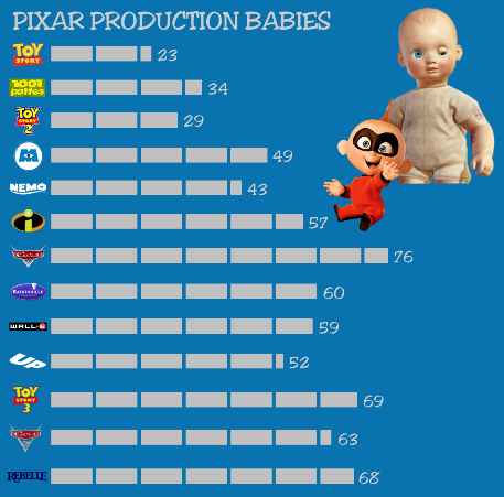 Les bébés Pixar Depuis leur premier film d'animation Toy Story sorti en 1995, les studios Pixar ont instauré une tradition : celle de mentionner les noms des enfants des personnes ayant collaboré à la création du film nés au cours de la production. La rubrique "Production Babies" a figuré à la fin du générique de fin de chacun des longs-métrages d'animation du studio d'Emeryville. Un décompte du nombre de bébés Pixar pour chaque film fait apparaître une augmentation logique des naissances à mesure que les effectifs du studio s'étoffaient. La palme du plus grand nombre de naissance au cours de la production revient à ce jour à Cars - Quatre Roues, avec 76 bébés, suivi par Toy Story 3 (69) et Rebelle (68). Certains films ont été prolifiques en naissances multiples. Cinq jumeaux sont ainsi nés lors de la réalisation de Cars - Quatre Roues, trois lors de celle de WALL·E. Des triplés ont vu le jour alors que le studio à la lampe achevait Cars 2. Parmi les prénoms remarquables, citons une Dorri née lors de la production de Le Monde de Nemo, deux Jack nés lors au cours de la conception de Les Indestructibles (un hommage à Jack-Jack Parr, le bébé de la famille Indestructible ?), une Ellie née alors que Là-Haut était en cours de réalisation. Le prénom Oscar a été donné à un enfant né lors de la production de Ratatouille, un autre lors de la réalisation de Rebelle. Leurs parents étaient sans doute visionnaires puisque ces deux films ont, après leur sortie, remporté l'Oscar du meilleur film d'animation !