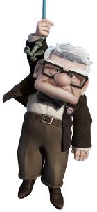 - Carl Fredricksen : veil homme à la tête et aux lunettes carrées, sa personnalité sera un aspect majeur. Les premiers trailers ont montré un personnage grincheux et un peu sadique, au tempérament bien trempé et à la réplique acerbe ! Alors que des infirmiers s'apprêtent à l'embarquer pour la maison de retraite, il lâche des centaines de ballons faisant décoller sa maison. Son projet : se rendre au Venezuela pour y voir la forêt tropicale afin d'honorer une promesse faite à sa femme décédée.